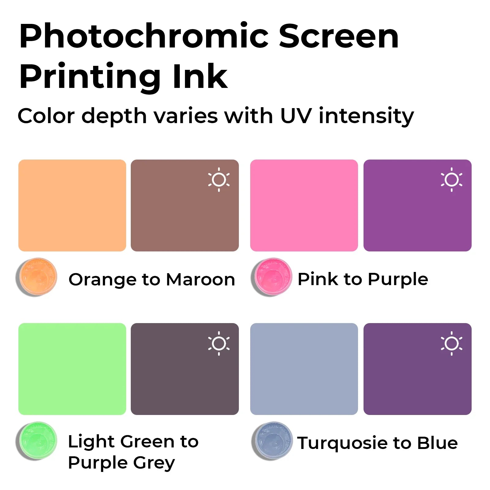 - Professional quality screen printing inks - The brand of choice for professional screen printers available across a broad range of colors. Photochromic screen printing ink sets will change color when exposed to UV light/sun.