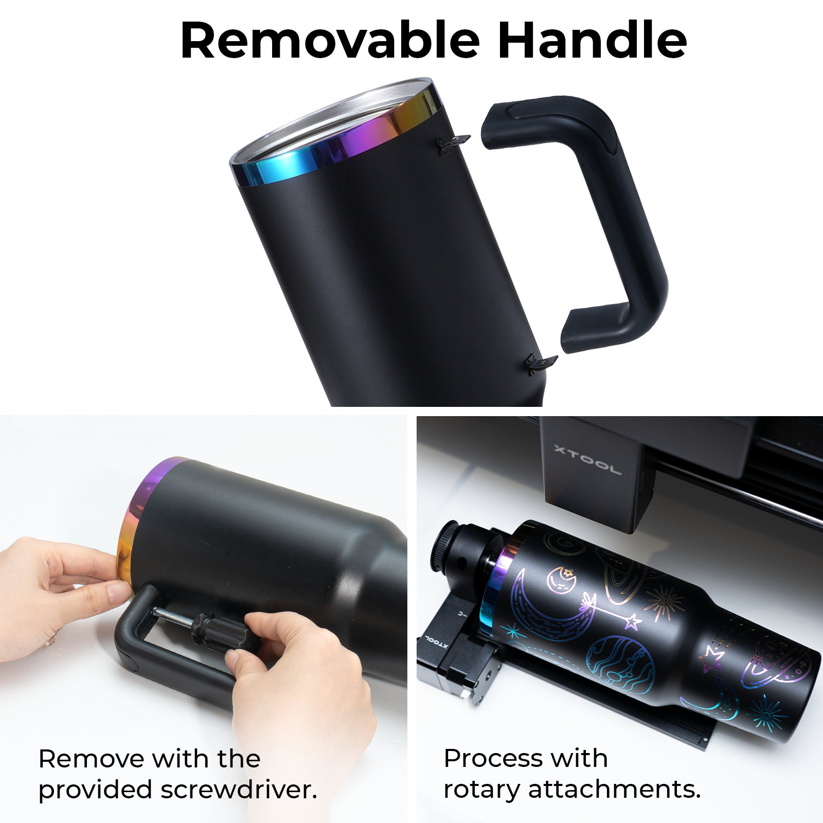 Due to the different colors of each computer, there will be some errors between the color and the actual color. Suggestion to use the provided screwdriver to remove the handle and utilize rotating attachments for processing when conducting extensive laser engraving. Exercise caution when using the cup to contain hot liquids to prevent scalding when using a straw.