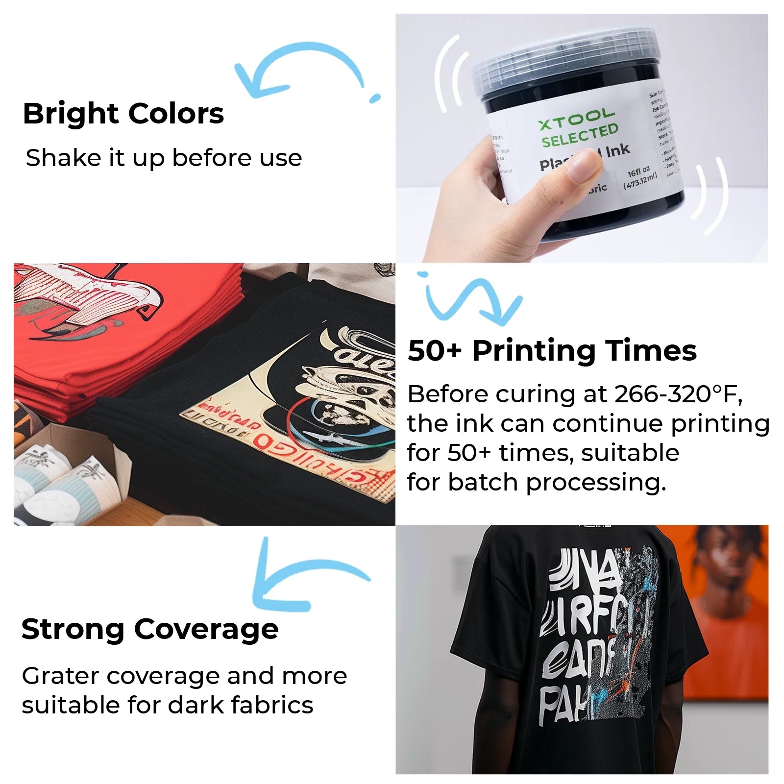 - Easy to use and process. Plastisol screen printing ink is incredibly easy to work with. Before use, simply give the ink a good stir to ensure smooth consistency. After screen printing, you can use xTool Heat Press or surveyor dryer, flash dryer, or heat gun for fast curing.