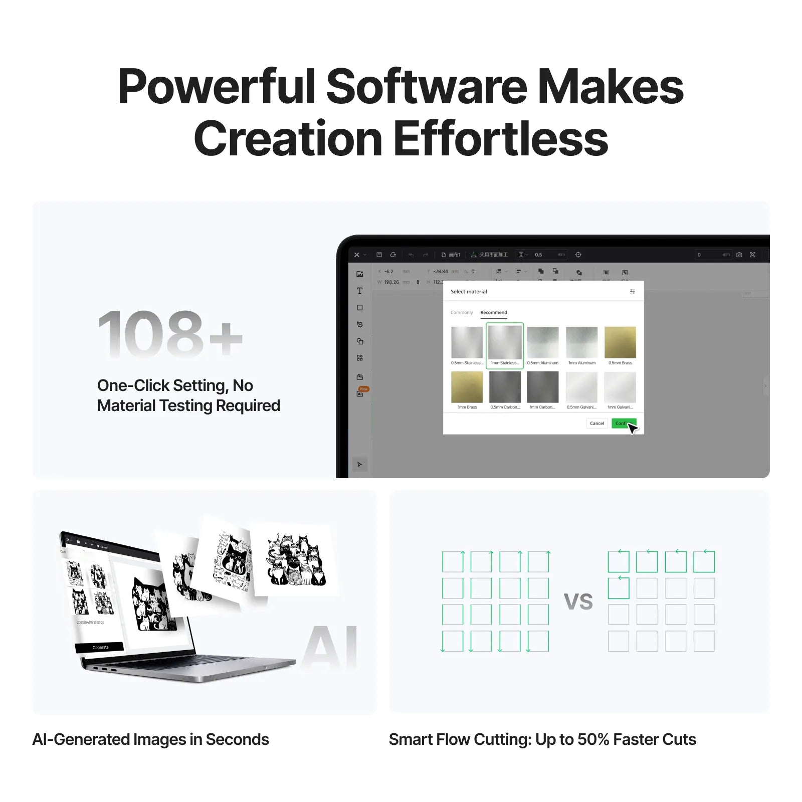It features the Material EasySet Library with100+ pre-optimized parameters for 30+ materials. You only need to select the material you want to cut, and all parameters can be applied with a single click. It also supports Auto Lead-in Lines, Automatic Path Optimization, which significantly improves cutting efficiency.