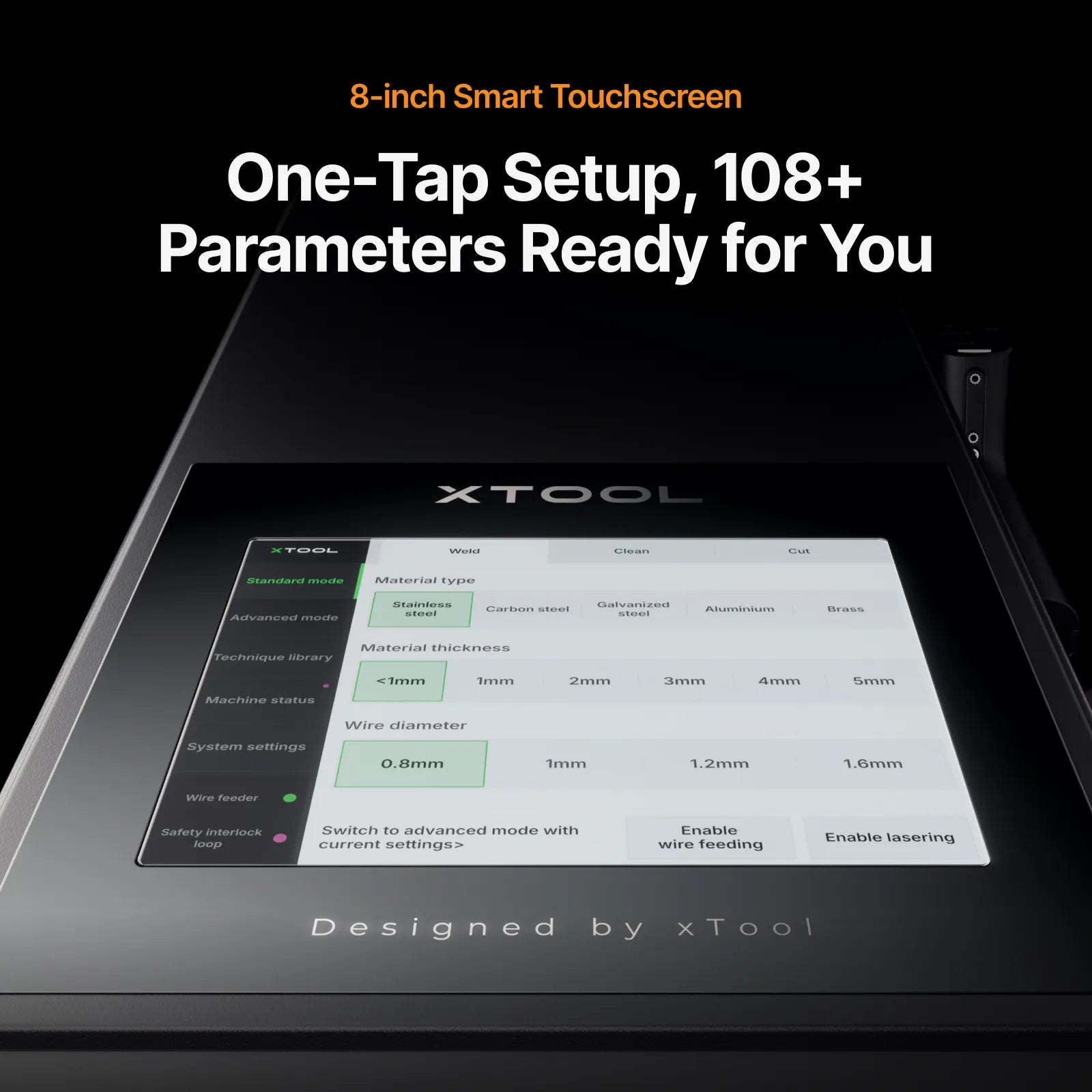 It features the 550g ultra-light integrated welding gun which enables a 5-second quick-release. The 8-Inch Smart Touchscreen has 108+ built-in parameters for one-click use.
