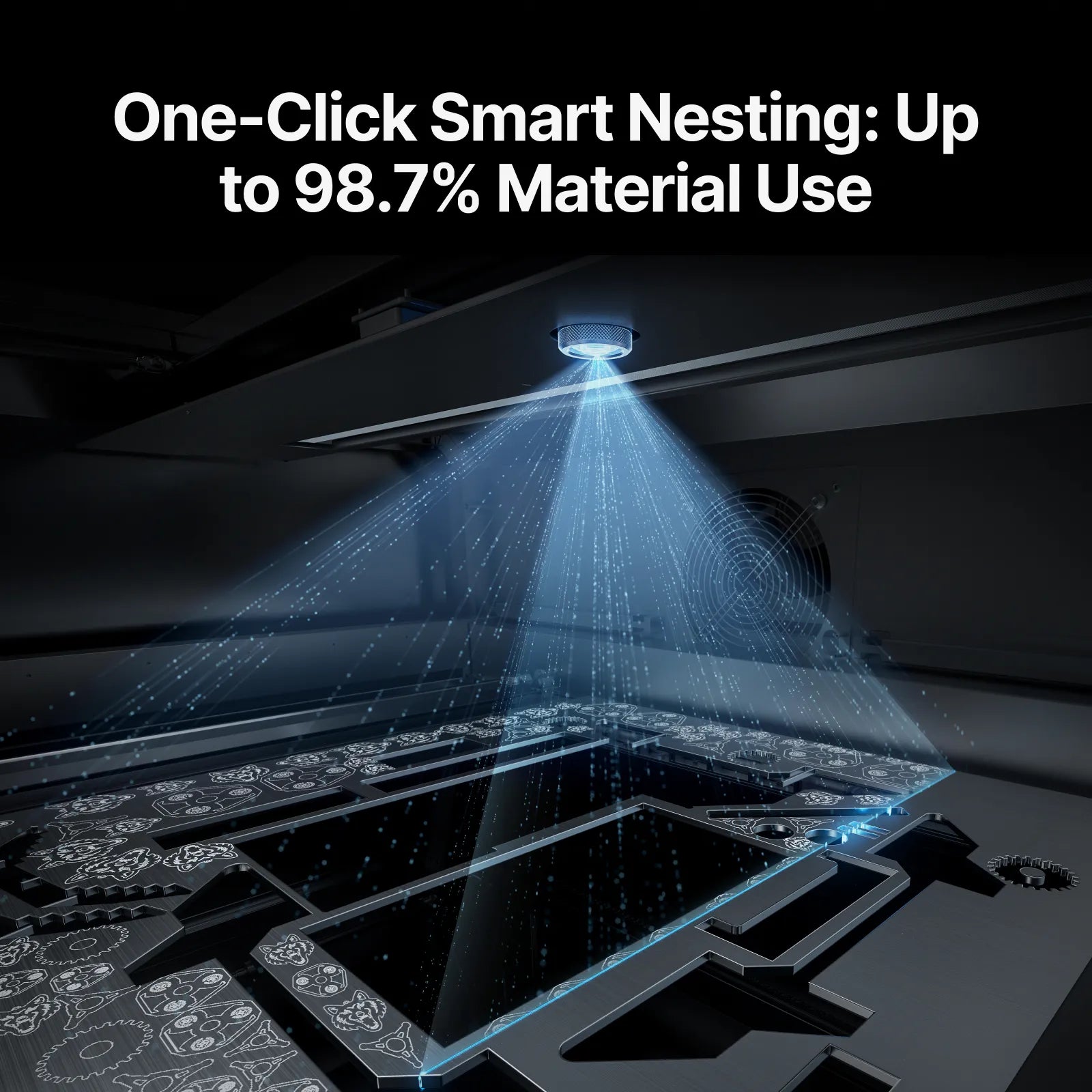 The 16MP Panoramic camera captures full-bed imaging for precise positioning and enables Smart Nesting function with up to 98.7% material use. The close-range camera enables micron-level precision for secondary/fine processing through localized high-res imaging.