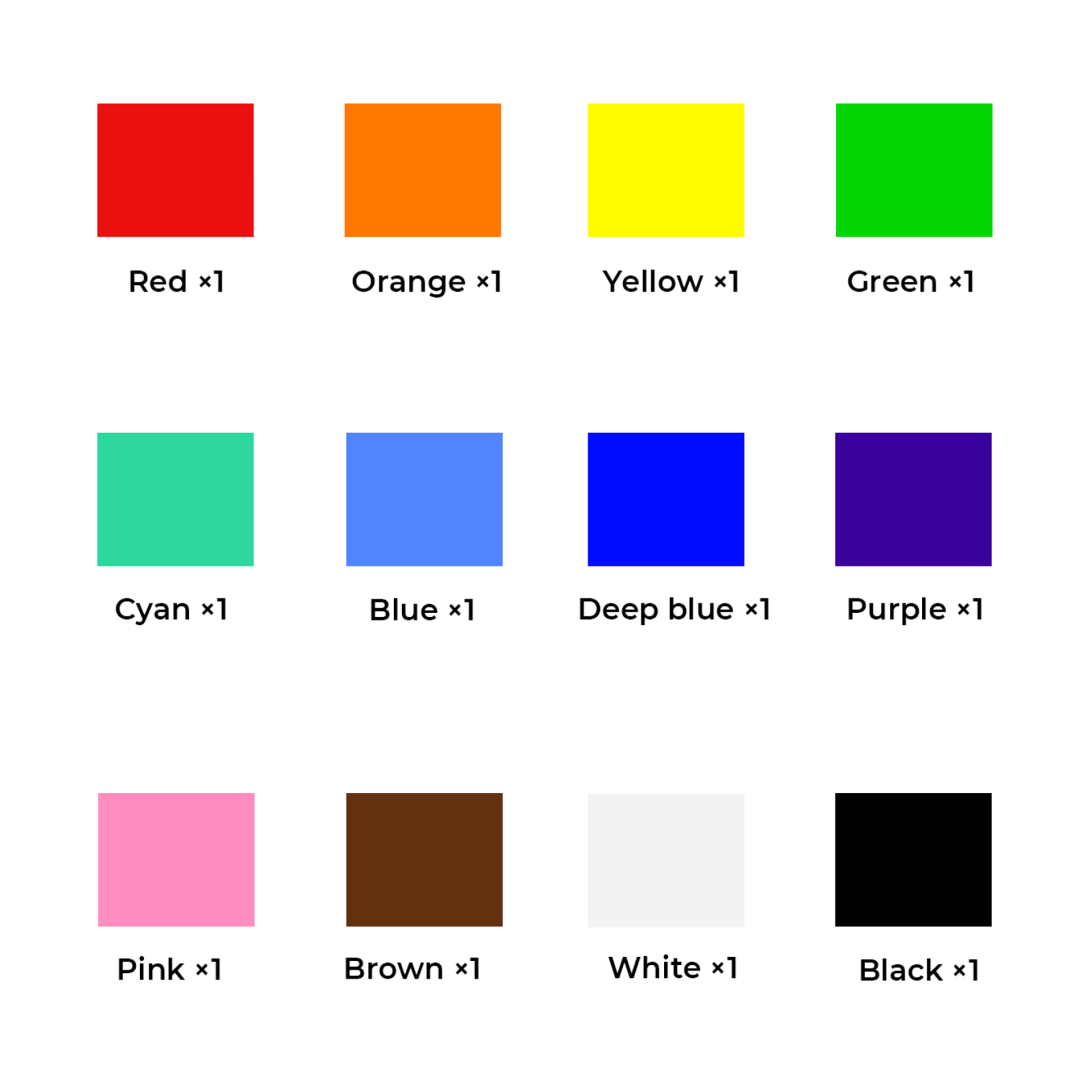 - ColorRed, Orange, Yellow, Green, Cyan, Blue, Deep Blue, Purple, Pink, Brown, White, Black