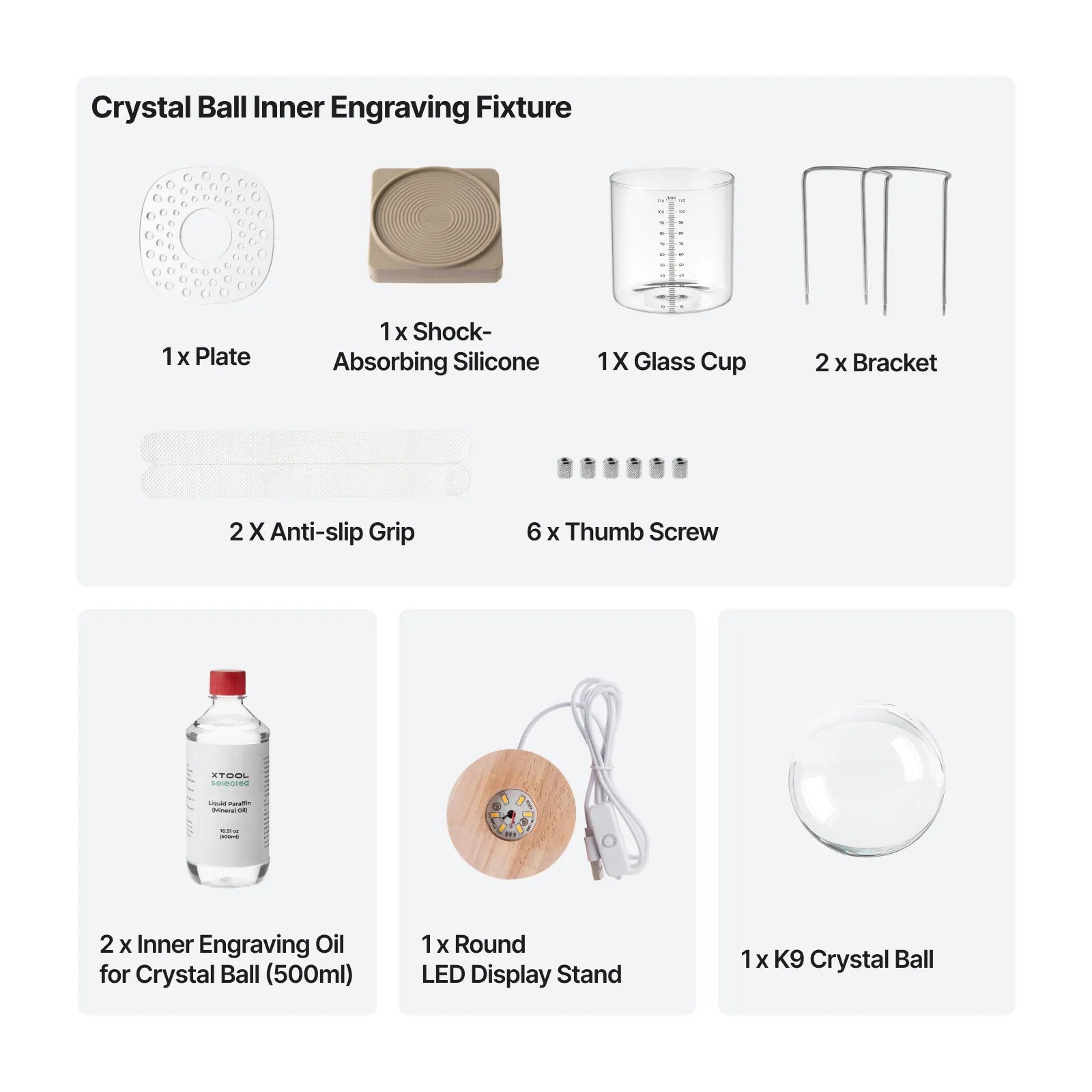 - Ready to carve right out of the box—a complete set. This kit is a comprehensive collection of supplies designed for creating engraved scenes inside crystal balls, covering everything needed from processing to display. Design for the xTool F2 Ultra UV.