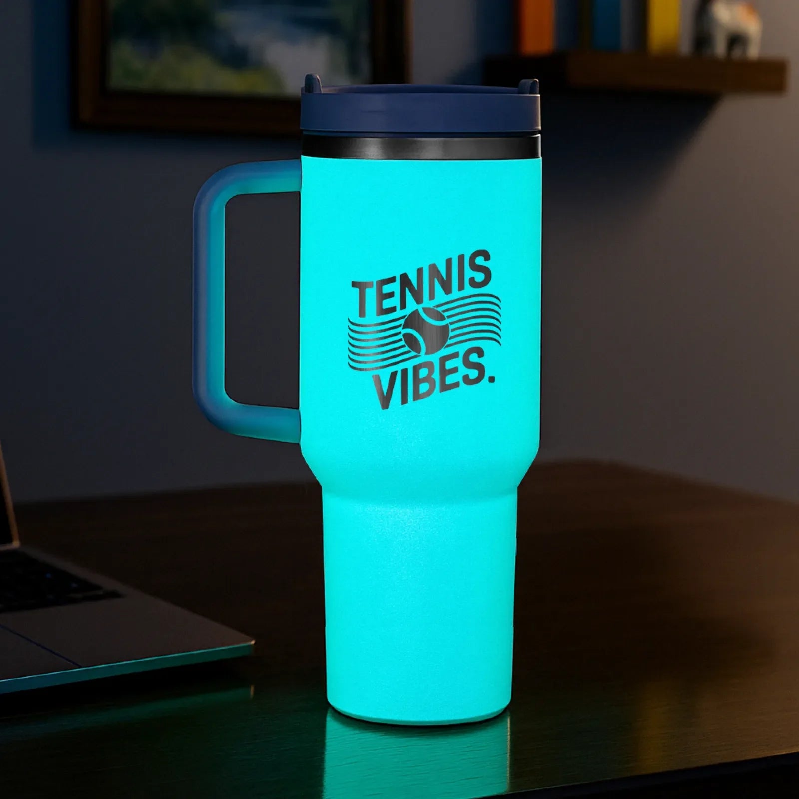 - This tumbler is coated with a unique glow-in-the-dark coating, which needs to absorb UV rays (exposed to sunlight) to have a glow-in-the-dark effect. It gives off a dreamy blue-green luminescence in the dark, creating a charming atmosphere. Perfect for nighttime use, and the cool color is perfect for parties!